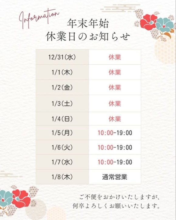 - 2027年1月7日〜通常営業(9時〜19時)になります